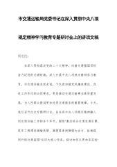 市交通运输局党委书记在深入贯彻中央八项规定精神学习教育专题研讨会上的讲话文稿同志们:在深入贯彻落实党的二十大精神,向着交通强国目标奋力迈进的关键时期,深入开展中央八项规定精神学习教育,对交通运输系统来说,不仅是加强党风廉政建设、改进工作作风的必然要求,更是推动交通运输事业高质量发展,为人民群众提供更加优质交通服务的重要保障。今天,我们召开此次专题研讨会,旨在将中央八项规定精神融入到交通运输工作的各个环节,围绕"激活综合交通发展引擎、筑牢工程建设铜墙铁壁、凝聚要素保障强大合力、绘就路网升级壮美蓝图"这四大核心任务,探讨如何以更加务实的作风、更加创新的举措,推动我市交通运输事业实现新的跨越。下面,...