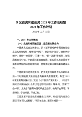 X区住房和建设局2021年工作总结暨2022年工作计划2022年X月X日一、2021年工作情况(一)党建引领双融双促,坚定初心聚合力一是落实党建主体责任。以习近平新时代中国特色社会主义思想为指导,增强“四个意识”,坚定“四个自信”,做到“两个维护”。贯彻“一岗双责”、“三重一大”、“第一议题”等制度,加强思想政治引领,守好意识形态责任田。落实局机关党委对下属事业单位的综合巡查机制,持续推进重点领域廉政建设工作。二是扎实推进党史学习。把党史学习教育作为当前和今后一个时期的重大政治任务高标准高质量落实。制定2021年党史教育实施计划,完成《论中国共产党历史》、《习近平新时代中国特色社会主义思想学习...