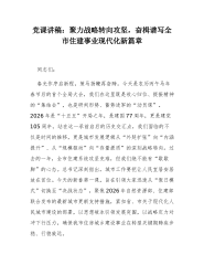 党课讲稿:聚力战略转向攻坚,奋楫谱写全市住建事业现代化新篇章同志们:春光作序启新程,策马扬鞭再奋蹄。今天是农历丙午马年春节后的首个全局大会,我们在这里既是收心归位、提振精神的“集结会”,也是研判形势、蓄势进军的“动员课”。2026年是“十五五”开局之年,是建国77周年,更是建党105周年。站在这一承前启后的历史交汇点,我们面临的不仅是时间的推移,更是城市发展逻辑从“外延扩张”向“内涵提升”、从“规模驱动”向“存量提质”的深刻战略转向。过去的一年,全市住建系统攻坚克难,但我们绝不能有“歇歇脚”的心态。总书记深刻指出,城市工作要把让人民宜居安居放在首位。今天的新春第一课,旨在引领大家迅速从“假日模...