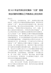 在2025年全县巩固拓展脱贫攻坚成果同乡村振兴有效衔接工作会议上的讲话同志们:历史,总是在一些重要节点,向我们提出一些根本性的问题。今天,我们站在五年过渡期的收官之年这个历史的交汇点上,讨论巩固拓展脱贫攻坚成果同乡村振兴有效衔接这项工作,不仅仅是部署一项具体任务,更是在回答一份深刻的时代问卷。如何从过去伟大的脱贫攻坚精神中汲取力量,又如何为未来全面的乡村振兴开辟道路?这需要我们不仅要做埋头苦干的“实干家”,更要做抬头看路的“思想者”,深刻把握其中蕴含的内在规律和辩证关系。下面,我围绕“五个关系”,与大家作一交流。第一,正确处理“巩固”与“拓展”的关系,在守住底线中开创新局巩固与拓展,是有效衔接...