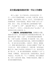县交通运输局派驻村第一书记工作感悟我叫x,2023年5月我来到x村担任驻村第一书记。x村位于思南县西南部,山大沟深,交通不便。面对这些难题,我主动谋划,想办法、出点子,运用在脱贫攻坚时期所积累下来的丰富经验,带领村“两委”班子心往一处想、劲往一处使,在乡村振兴路上当好党的政策“宣传员”、产业发展“主力军”、基层治理“带头人”、为民服务“领头羊”,一步步让x村绿水青山变成“金山银山”,向宜居宜业和美乡村阔步进行。一、党建引领,当好组织建设开拓者。党建强则乡村强,党建兴则乡村兴。农村党组织作为党的建设的神经末梢,是党联系群众的“最后一公里”,只有把村级党组织建好建强,才能干出成绩,为民造福。作为驻...