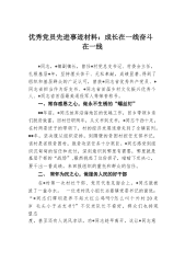 优秀党员先进事迹材料:成长在一线奋斗在一线*同志,*镇副镇长,曾任*村党总支书记、村委会主任,扎根基层*年,坚持埋头苦干、无私奉献,成绩显著,得到了组织和基层群众的广泛认可,曾获*同志省优秀共产党员、*同志省担当作为好支书、*同志省首届乡村文化振兴优秀个人、*同志省首届最美退役军人等荣誉称号。一、常存感恩之心,做永不生锈的“螺丝钉”**年前,*同志放弃沿海地区的优越工作,回乡带领乡亲们脱贫致富。回村任职两年,从文书到支书,*同志干劲十足,在村两委班子的带领下,村的经济发展逐渐走到了全镇前列。**年,坚决服从组织安排,到隔壁的贫困村担任支部书记,该村是省级贫困村,脱贫攻坚任务十分艰巨。*同志感受...