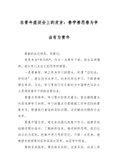 在五四青年干部座谈会上的讲话:青年干部要当好讲纪律守规矩的表率(党纪学习教育)同志们:“五四”青年节刚刚过去,在这繁花似锦的日子里,我们召开青年座谈会,目的就是要掌握青年工作和思想状态,了解青年所思所盼所想,引领青年统一思想认识,不忘初心跟党走、砥砺奋进新征程。刚才,青年代表结合岗位实际,畅谈了自己对党的认识、成长过程中的心得体会都讲得很好,很到位。借今天这个机会,结合近期开展的集中性纪律教育,向青年提几点希望,与大家共勉。一、严守政治纪律,自觉维护党的团结统一在党的各项纪律规矩中,政治纪律是第一位的。政治纪律是党的生命线,是维护党的团结统一的重要保障。在学习中,我深刻体会到,作为一名党员干部...