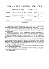 202x年5月党支部党日活动(党课)记录表党组织名称:xx党支部202x年5月x日活动时间202x年5月x日地点xx会议室主持人xx活动主题弘扬五四精神,争做时代先锋——党支部主题党课活动记录人xx出席人xx党支部全体党员活动内容记录为激发党员活力,发挥党员先锋模范作用。202x年5月x日下午,xx党支部开展“弘扬五四精神,争做时代先锋——党支部纪念五四精神”主题党日(党课)活动。xx党支部通过主题党课形式纪念五四运动101周年,激励广大青年党员弘扬“五四”精神,爱国奋斗,激发内在活力,发挥新时期党员先锋模范作用,为实现中华民族伟大复兴的中国梦而砥砺前行。支部书记xx在党课中指出,身为xx,如...