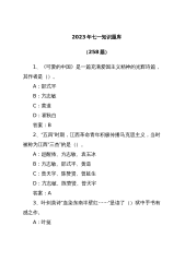 2023年七一知识题库(258题)1、《可爱的中国》是一篇充满爱国主义精神的光辉诗篇,其作者是()。A:邵式平B:方志敏C:黄道D:瞿秋白答案:B2、“五四”时期,江西革命青年积极传播马克思主义,当时被称为江西“三杰”的是()。A:赵醒侬、方志敏、袁玉冰B:方志敏、邵式平、黄道C:曾天宇、陈赞贤、曾延生D:方志敏、陈赞贤、曾天宇答案:A3、叶剑英诗“血染东南半壁红……”是读了()狱中手书有感之作。A:叶挺B:方志敏C:瞿秋白D:刘伯贤答案:B4、抗日战争全面爆发后,在南方八省边界地区的红军和游击队改编为国民革命军陆军新编第四军,()任军长。A:叶挺B:陈毅C:项英D:方志敏答案:A5、1924...
