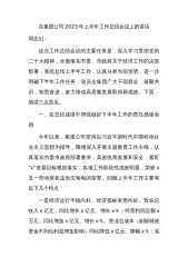 在集团公司2023年上半年工作总结会议上的讲话同志们:这次工作总结会议的主要任务是,深入学习贯彻党的二十大精神,全面落实市委、市政府关于经济工作的决策部署,系统总结上半年工作,认真分析当前形势,进一步明确下半年工作任务,动员全集团广大干部群众,凝聚共识,知责奋进,奋力推动高质量发展取得新成效。下面,我讲三点意见。一、在总结成绩中增强做好下半年工作的责任感使命感今年以来,集团公司坚持以习近平新时代中国特色社会主义思想为指导,围绕深入开展主题教育工作主线,认真落实市委市政府部署要求,高效统筹发展和安全,紧盯“x”发展目标狠抓落实,各项工作阶段性成效明显,荣获x五一劳动奖状这份沉甸甸的荣誉。回顾上半...