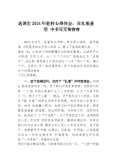 选调生2024年驻村心得体会:在扎根基层中书写无悔青春2021年9月,沿着乌江河畔,穿过群山峻岭,我怀揣着为民服务的赤子初心来到x,踏上了基层选调之旅。一路走来,从初来乍到的懵懂无知到轻车熟路,从读有字之书到阅无字之书,从一个“门外汉”逐渐成长为“多面手”,在扎根基层热土中更加坚定了心中“选之于党,调之于任,生而为民”的选调使命,终于也就如何当好选调生这个问题逐渐有了自己的答案。一、放下选调光环,在向下“扎根”中转变角色。初到x,我被安排到五一村,村干部们对我非常热情,但同时对这样一个99年的小姑娘产生了工作质疑,认为“这孩子待不长,做不了什么事”。确实,对于刚毕业不久的我,从刚出“象牙塔”的...
