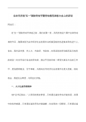 在全市庆祝“五一”国际劳动节暨劳动模范表彰大会上的讲话同志们:在“五一”国际劳动节来临之际,我们欢聚一堂,共同庆祝这个属于全体劳动者的节日,隆重表彰为全市经济社会发展作出积极贡献的先进集体和先进个人。首先,我代表市委、市人大、市政府、市政协,向受表彰的劳动模范表示热烈的祝贺!向全市各行各业的劳动者,致以节日的问候!希望大家在今后的工作中,更加爱岗敬业、甘于奉献,为推动全市经济社会发展作出更大贡献。借此机会,我提五点希望,与同志们共勉。一、大力弘扬劳模精神XJP总书记指出:“人世间的美好梦想,只有通过诚实劳动才能实现;发展中的各种难题,只有通过诚实劳动才能破解;生命里的一切辉煌,只有通过诚实劳动...