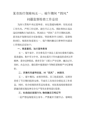 某市医疗保障局五一、端午期间“四风”问题监督检查工作总结为深入贯彻中央纪委和省、市纪委通知精神,切实改进工作作风,严明工作纪律,刹住不正之风,预防和制止违法违纪和腐败行为的发生,坚决防止“四风”在节日期间反弹,某市医疗保障局结合实际情况,坚持教育学习到位,监督检查到位,现将医保系统五一、端午期间廉洁自律和作风建设工作情况总结如下:一、高度重视,加大宣传教育五一、端午前夕,在全体党员干部会上某市纪委相关通知,要求通知,集中学习中央、某市纪委关于作风建设的系列文件精神,重申纪律要求,教育引导广大职工严守纪律、廉洁过节。同时,在总办会、微信群中强调端午节物资采购要严守纪律规矩。二、开展作风督导巡查,...