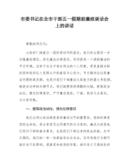 市场监督管理局党委书记在2025年“五一”劳动节集体廉政谈话会上的讲话同志们:“五一”劳动节将至,为进一步贯彻落实中央八项规定精神,纠正“四风”,防止“节日病”反弹,今天,我们召开“五一”劳动节集体廉政谈话会,目的是进一步严明纪律规矩,提升廉洁自律意识,加强预防措施,引导全体干部职工携手打造一个廉洁、清正的节日环境。刚才,我们一起学习了相关文件和典型案例通报,希望大家深刻汲取教训,引以为戒。下面,我讲几点意见,与同志们共勉。一、提高政治站位,强化思想认识(一)充分认识廉政建设的重要性。党风廉政建设和反腐败斗争是关系党和国家生死存亡的重大政治任务。党的十八大以来,以习近平同志为核心的党中央以“得...