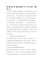 XX镇XX村2021-2025年工作总结(精品)2过去的五年,是XX村在XX镇党委、政府的坚强领导下,全面贯彻落实乡村振兴战略,团结带领全村党员群众锐意进取、攻坚克难的五年。五年来,XX村党支部与村民委员会始终坚持以习近平新时代中国特色社会主义思想为根本遵循,深入学习和践行党的二十大精神,紧密围绕“党建引领强基础、产业发展促增收、民生改善暖人心、乡村治理优环境”的核心工作主线,将全村人民对美好生活的向往作为奋斗目标,圆满完成了本届任期的各项既定任务,为XX村迈向更高质量、更可持续的发展新阶段奠定了坚实的基础。本报告旨在系统回顾过去五年的工作实践,总结经验,剖析不足,并对未来发展进行展望。一、坚...
