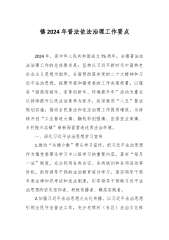 市农业农村局2024年普法依法治理工作要点 2024年是中华人民共和国成立75周年,是实现“十四五“规划目标任务的关键一年,也是全面落实“八五”普法规划的重要一年。全局普法依法治理工作,要以习近平新时代中国特色社会主义思想为指导,深入学习贯彻习近平法治思想,认真贯彻落实党的二十大和二十届历次全会精神、习近平总书记对贵州对XX工作的重要指示批示精神,衷心拥护“两个确立”、忠诚践行“两个维护”,以提升公民法治素养为目标,全面深化普法责任制落实,深入推进多层次多领域依法治理,推动“八五”普法规划全面实施,为全面推进农业农村现代化和乡村振兴提供有力法治保障。 一、加强思想政治建设,深入学习习近平法...
