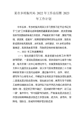 XX区乡村振兴局2022年工作总结及2023年工作计划2022年是巩固脱贫攻坚成果与乡村振兴有效衔接的第二年,XX区按照中央、省、市部署安排,认真落实中央一号文件重要指示精神,牢牢守住不发生规模性返贫的底线,突出年度性任务、针对性举措、实效性导向,充分发挥农村基层党组织领导作用,扎实有序XX乡村发展、乡村建设、乡村治理重点工作,巩固脱贫攻坚成果与乡村振兴有效衔接取得新进展。现将有关情况汇报如下:一、基本情况XX区是某市的中X区,全区有XXX镇X个村(社)承担有巩固脱贫攻坚成果任务。其中,X个省级重点帮扶村,X个脱贫村,X个示X区,X个省级示范村。截止11月底,全区一般脱贫户、监测户共X户X人,...