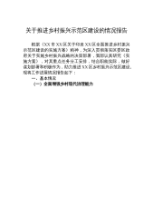 关于推进乡村振兴示范区建设的情况报告根据《XX市XX区关于印发XX区全面推进乡村振兴示范区建设的实施方案》精神,为深入贯彻落实区委区政府关于实施乡村振兴战略的决策部署,我部认真研究《实施方案》,对其重点任务分工安排,结合职能实际,做好谋划部署和积极作为,助力推进XX区乡村振兴示范区建设。现将工作进展情况报告如下:一、基本情况(一)全面增强乡村现代治理能力1.关于“实施村民德治建设工程”。2022年,XX区充分发挥新时代文明实践中心(所、站)的阵地平台作用,扎实推进乡村振兴示范区建设,有效打通了宣传群众、教育群众、关心群众、服务群众的“最后一公里”,为乡村振兴营造了良好的舆论氛围和社会环境。一是...
