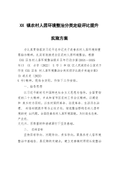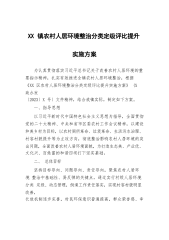 XX镇农村人居环境整治分类定级评比提升实施方案为认真贯彻落实习近平总书记关于改善农村人居环境的重要指示精神,扎实有效推进全镇农村人居环境整治,根据《XX区农村人居环境整治分类定级评比提升实施方案》(X政办发〔2023〕X号〕文件精神,结合我镇实际,制定如下方案。一、指导思想以习近平新时代中国特色社会主义思想为指导,全面贯彻党的二十大精神、中央和省市区委农村工作会议精神,以建设和美乡村为目标,以农村厕所革命、垃圾革命、生活污水治理、村容村貌提升等为主攻方向,彻底整治影响农村人居环境的突出问题,全面改善农村人居环境面貌,为打造生态美、产业优、文化兴、百姓富的和谐四坝打下坚实基础。二、总体目标坚持目...