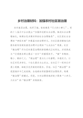 乡村治理典型案例材料(村级)近年来,*市*县*镇*村深入贯彻落实中央和省市县推进乡村治理的系列决策部署,坚持以高质量发展促进高水平治理,取得了村美业兴人和的良好成效。一、建强基层组织,筑牢发展“主心骨”。*村始终坚持把夯实村级党组织建设作为优化乡村治理、推进乡村振兴的根本保障,严格落实“四抓两整治”、村干部“两强两化”工程和村文书专职化选聘等工作要求,结合村"两委”换届,坚持在"能人"中选“强人",把致富带富能力强的党员群众吸纳进村“两委”班子,完成了村党组织书记、村委会主任“一肩挑”和村专职化文书选聘,村班子结构进一步优化,锻造了坚强的战斗堡垒,夯实了振兴农村的基础。组织村干部和致富带头人到...