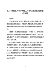 在XX集团2025年度工作会议暨表彰大会上的讲话同志们:今天,我们齐聚一堂,召开集团年度工作会议暨表彰大会。主要任务是,回顾总结过去一年的工作,表彰先进,分析当前形势,部署新一年的战略任务,动员全体员工向着更高远的目标奋勇前进。过去的一年,是集团发展史上极不平凡的一年。面对风高浪急的外部环境和艰巨繁重的改革发展任务,全体XX人用汗水和智慧,交出了一份来之不易的优异答卷。我们不仅稳住了阵脚,更实现了逆势上扬。在此,我向大家通报一组核心数据。截至2024年底,集团全年实现总产值2500亿元,同比增长15.2%,超额完成年度目标。固定资产投资达到300亿元,50个重点项目投资完成率超过95%。集团研...