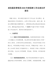 政务服务管理局2025年度保密工作自查自评报告根据《机关、单位保密自查自评工作办法》有关要求,我局组织保密工作机构牵头,会同文件综合运转、组织人事、信息化管理和服务保障等部门,对照保密法等法律法规及规范性文件,围绕xx类基本项目,于2025年12月开展了年度保密工作自查自评。现将有关情况报告如下。一、自查情况(一)保密工作责任制落实情况。我局党组将保密工作纳入年度重点工作统筹部署,局主要负责同志履行保密工作第一责任人职责,分管负责同志具体抓落实。年初召开保密工作专题会议,研究部署全年保密工作任务,明确各科室(单位)负责人为本部门保密工作直接责任人。将保密工作纳入年度目标责任考核,与业务工作同部...