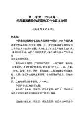 第一采油厂2023年党风廉政建设和反腐败工作会议主持词***(2023年2月8日)同志们:今天我们以视频会议的形式召开第一采油厂2023年党风廉政建设和反腐败工作会议,对我厂下一步党风廉政建设和反腐败工作作出具体安排和部署,充分彰显了厂党委严格落实党中央、集团公司党组、油田公司党委要求,深入推进全面从严治党的坚定决心和鲜明态度。参加本次会议的有:厂领导班子成员、一级工程师、副总师;纪委委员、各党支部纪检委员;机关部门负责人,计划、人事、财务、企管、物资、外协、事务管理、工程项目建设等关键岗位人员;基层单位党政主要领导、在岗领导班子成员、关键岗位人员,以及专兼职纪检干部等,共计**人。今天的会议...