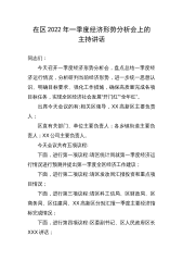 在区2022年一季度经济形势分析会上的主持讲话同志们:今天召开一季度经济形势分析会,盘点总结一季度经济运行情况,分析研判当前经济形势,进一步统一思想认识、明确目标要求、强化工作措施,确保高质量完成各项目标任务,实现全区经济社会发展“开门红”“全年红”。出席今天会议的有:相关区领导,XX高新区主要负责人;区直有关部门、单位主要负责人;各乡镇街道主要负责人;XX公司主要负责人。今天会议共有五项议程:下面,进行第一项议程:请区统计局就第一季度经济运行情况进行预测并提出第一季度全区经济工作建议;下面,进行第二项议程:请区发改局汇报投资和重点项目情况;下面,进行第三项议程:请区科工信局、区财政局、区商务...