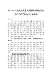 在2025年全县高质量发展暨第三季度经济运行分析工作会议上的讲话同志们:今天,我们召开全县高质量发展暨第三季度经济运行分析工作会议,主要任务是深入学习贯彻上级关于推动高质量发展的系列重要会议精神,全面总结今年以来我县经济社会发展的成绩与不足,精准研判当前面临的形势与挑战,并对第三季度及下一阶段的重点工作进行系统部署。刚才,会议传达了省、市相关会议的核心精神,相关部门也汇报了全县高质量发展、经济运行及重点项目的具体情况,分析客观深入,提出的建议也很有针对性。下面,结合大家的发言和我的思考,我讲三点意见。一、客观总结成绩,清醒认识挑战,准确把握当前发展态势今年以来,面对复杂多变的宏观环境和艰巨繁重...