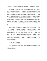 在自治区党委进一步改进作风狠抓落实工作推进会上的讲话自治区第十次党代会以来,自治区党委连续三年节后召开改进作风狠抓落实工作会,主要任务是深入贯彻落实习近平总书记关于作风建设的重要指示和新时代党的治藏方略,贯彻落实中央召开的整治形式主义为基层减负专项工作机制会议精神,交流经验做法、相互学习借鉴,以自我革命精神把作风建设一抓到底、抓出成效,为社会主义现代化新X建设提供坚强保障。刚才,X等6名同志作了很好的发言。大家的发言,思想认识上有高度,工作措施上有力度,工作成效上有亮点,体现了从区直部门、地(市)直单位到县(区、市)、乡镇(街道)、村(社区)抓作风建设的好做法好经验,为各级各部门各单位抓好作风...
