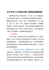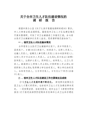 关于全市卫生人才队伍建设情况的调研报告根据市委办公室《关于认真开展摸底调研的通知》要求,市人大常委会组成调研组,围绕我市卫生人才队伍建设情况开展专题调研,听取了市卫生健康委工作情况汇报,并与部分医疗卫生健康单位负责人座谈。现将调研情况报告如下。一、我市卫生人才队伍基本情况全市现有公立医疗卫生健康单位某个,其中市级某个,县级某个,乡镇(社区)级某个,村级某个;在职人员某人,在编人员某人,临聘及人事代理人员某人(含乡村医师某人)。在职人员中专业技术人员某人,占比某%,其中执业(助理)医师某人,注册护士某人,药师某人,技师某人,公卫人员某人;副高级以上职称人员占某%,中级职称人员占某%,初级职称人员...