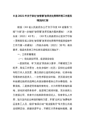 X县2021年关于深化“放管服”改革优化营商环境工作落实情况的汇报根据《XX省人民政府办公厅关于印发XX省服务“六稳”“六保”进一步做好“放管服”改革实施方案的通知》(X政办发〔2021〕43号)、《XX市人民政府办公室关于印发<贯彻落实省上深化“放管服”改革优化营商环境提质提标年工作方案>的通知》(市政办发电〔2021〕30号)相关要求,我县对具体工作任务完成情况汇报如下:一、工作开展情况(一)优化就业环境,促进就业创业一是按照省、市“大就业”系统录入要求,不断规范工作程序,靠实工作责任,在各乡镇村(社区)安排社会保障专职工作人员负责,重点抓好公益性岗位补贴、社保补贴等模块的信息录入,一次性...