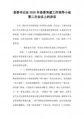 县委书记在2025年县委党建工作领导小组第二次会议上的讲话今天,我们召开县委党建工作领导小组第二次会议,主要任务是深入学习贯彻习近平总书记关于党的建设的重要思想,全面落实中央和省委、市委关于党建工作的最新部署要求,总结上半年全县党建工作成效,分析当前形势,部署下一阶段重点任务。下面,我讲三个方面意见。一、聚焦政治引领,坚决扛牢新时代党建工作使命担当党的二十大报告强调,全面建设社会主义现代化国家、全面推进中华民族伟大复兴,关键在党。作为县级党委,我们必须始终把党的政治建设摆在首位,以高度的政治自觉和行动自觉推动全面从严治党向基层延伸。(一)坚持把党的政治建设作为根本性建设。政治属性是党组织的根本...