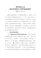 神木市总工会2024年度重点工作任务总结报告(2025年1月13日)2024年是贯彻党的二十大精神的关键之年,是推动“十四五”规划任务全面落地的攻坚之年。一年来,在神木市委、市政府正确领导和上级业务部门具体指导下,神木市总工会坚持以习近平新时代中国特色社会主义思想和中国工会十八大精神为指导,贯通落实党纪学习教育、“县级工会加强年”活动部署要求,紧扣全总“559”部署安排,扎实履行参与、维护、建设、教育职能作用,较好地完成了各项任务。现就2024年目标任务完成情况对标汇报如下:一、共性任务稳步推进(一)落实全面从严治党主体责任方面。市总工会党组始终把落实全面从严治党工作摆在突出位置,坚持“一把手...