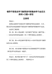 领导干部党史学习教育读书班集体学习会议主持词+方案+讲话主持词同志们:按照全县领导干部党史学习教育读书班活动安排,今天,我们召开全体县级领导干部党史学习教育读书班集体学习会议。会议共三项议程。第一项,请××同志领学《论中国共产党历史》篇目节选——《在纪念毛泽东同志诞辰一百二十周年座谈会上的讲话》。…………………………………………第二项,请××同志领学市委书记××在全市党史学习教育动员大会上的讲话。…………………………………………第三项,请大家集中观看由中央党校教授罗平汉讲授的《朱毛红军与古田会议》专题片。…………………………………………同志们,刚才我们集中学习了《在纪念毛泽东同志诞辰一百二十周...