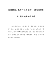 经验做法:抓好“三个导向”强化巡防要素提升治安管控水平 *工作开展以来,*县局立足“县级主战、派出所主防”定位,以治安形势为“晴雨表”,以社情民意为“风向标”,深入推进*主题实践活动与健全完善城区巡防机制结合,持续强化社会面管控“末端触角”建设,社会治理水平进一步提档升级。 一、抓问题导向,注重因势求变,促巡防措施调整提升。一是抓“关键少数”靠前指挥,促快侦快补快挽损。针对*县城区先后发生*起“拉车门”“撬车库”警情的实际,*县局迅速启动“关键少数”带头包小区机制,局领导、警种部门、派出所主要负责人等第一时间到案发小区开展“案件督导、现场复盘、安防补漏”等工作,为快速破案追赃挽损、找准安防...