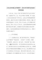 XX县全面加强生态环境保护、坚决打好污染防治攻坚战工作情况报告今年以来,全县上下深入学习贯彻习近平生态文明思想,全面落实中央、省、市生态环境工作部署,深入实施八大标志性战役30个专项行动,全县生态环境质量持续保持稳定。2023年全县空气质量达到国家二级标准,PM2.5平均浓度28微克/立方米,同比上升12%,空气质量优良率96.6%,同比上升5.4个百分点。全县各国控断面和省控断面水质优良率100%,县级集中式饮用水源地水质达标率100%,全县受污染耕地安全利用率达到93%以上。现将工作情况汇报如下。一、工作开展情况(一)坚持高点站位,着力树牢绿色导向。严格落实生态环境保护“党政同责、一岗双责...