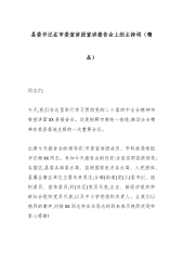 县委书记在市委宣讲团宣讲报告会上的主持词(精品)同志们:今天,我们在这里举行学习贯彻党的二十届四中全会精神市委宣讲团XX县报告会。这是按照市委统一安排,推动全会精神在我县落地生根的一次重要会议。出席今天报告会的领导有:市委宣讲团成员、市科技局党组书记杨XX同志。参加今天报告会的还有:全县实职县级领导;各园区,县委各部委办局、县级国家机关各办局、人民团体、县属企事业单位主要负责同志;乡镇(街道)党(工)委书记、组织委员、宣传委员;村(社区)党员代表,企业、新经济组织和新社会组织党员代表,以及中小学党组织负责人。让我们以热烈的掌声,对杨XX同志和各位同志的到来表示热烈欢迎和衷心感谢!党的二十届四中...