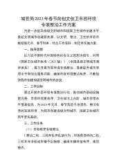 城管局2023年春节前创文创卫市容环境专项整治工作方案为进一步提高省级文明城市和国家卫生城市创建水平,掀起文明城市创建新热潮,以文明、整洁、卫生的市容市貌迎接元旦、春节到来,结合工作实际,制定本实施方案。一、指导思想以习近平新时代中国特色社会主义思想为指引,对照《国家卫生城市标准(2021版)》《全国县级文明城市测评体系》,着力开展市容环境专项整治,显著提升城市管理水平和综合服务功能,确保市容环境整洁有序,不断加快我市创建省级文明城市的步伐。二、工作目标通过开展市容环境专项整治行动,推动城市基础设施更完善、市容环境更有序、卫生保洁上台阶,城市管理水平显著提高,为2023年元旦、春节营造干净漂亮...