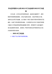 市生态环境局X分局2021年工作总结和2022年工作思路今年以来,在市生态环境局和县委、县政府正确领导下,我局狠抓环保督察迎检整改,深化污染防治攻坚,强化环境执法力度,加快生态文明示范创建,全力推动“十四五”高标开局和共同富裕示范建设,各项工作取得阶段性成效。X县再获五水共治“大禹鼎”和美丽X建设工作考核优秀县两项省级重大荣誉,我局获评X省打赢蓝天保卫战成绩突出集体,连续第二年获评全国生态环境保护执法大练兵县级表现突出集体。一、2021年工作总结(一)铆足干劲,护航环保督察迎检。最高站位、严阵以待、全力以赴抓实二轮省督迎检准备。县委、县政府主要领导多次召开会议精心部署动员,多次组织开展横向到边...