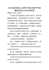 在在全县科级以上领导干部元旦春节节前廉政谈话会上的主持讲话尊敬的XX书记,同志们:今天我们召开全县科级以上领导干部元旦、春节节前廉政集体谈话会,主要目的是深入学习党的二十大精神,认真贯彻落实党中央和省、市委关于做好元旦春节正风肃纪工作部署,进一步严明纪律要求,增强廉洁自律意识,提高拒腐防变能力,营造风清气正的节日氛围,为推动民和经济社会高质量发展提供坚强保障。参加今天会议的有:县委书记XXX,在家县级领导,各乡镇党委书记、乡镇长,县委各部门、县直各单位(含二级局)、各人民团体、县属国有企业主要负责同志。今天的会议共有四项议程,下面分项进行:刚才,大家观看了专题片《作风建设永远在路上(第三集:狠...