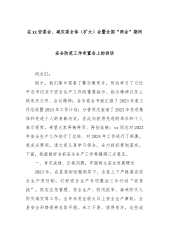 在xx安委会、减灾委全体(扩大)会暨全国“两会”期间安全防范工作布置会上的讲话同志们:刚才,我们集中观看了警示教育片,传达学习了习近平总书记关于安全生产工作的重要指示、批示精神以及上级有关文件、会议精神;各专委会书面汇报了2023年度工作总结暨2024年工作计划;分管同志宣读了2023年先进集体和先进个人的表彰决定,在此向获得先进的单位和个人表示祝贺,希望大家再接再厉、再创佳绩;xx同志对2023年安全生产工作进行了总结、对2024年工作进行了部署,我完全赞同,请大家认真学习领会,全力抓好贯彻落实。下面,我就做好当前安全生产工作再强调三点意见。一、肯定成绩、正视问题,牢固树立安全发展理念202...