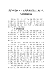 县委书记在2025年度民主生活会上的个人对照检查材料根据本次民主生活会的要求,我紧紧围绕会议主题,在前期深入学习党的创新理论、广泛征求意见建议、深入开展谈心谈话的基础上,联系个人思想、工作和作风实际,进行了深刻的自我剖析和反思。现将个人对照检查情况报告如下,请同志们批评指正。一、存在的突出问题今年以来,在党中央和省委、市委的坚强领导下,我与县委班子成员一道,团结带领全县干部群众,积极应对各种风险挑战,全力推动经济社会高质量发展,各项工作取得了一定进展。但对照党章党规,对照初心使命,对照人民群众新期待,对照先进典型,我深感自身还存在不少差距和不足。在理论学习方面,虽然能够坚持参加集体学习,也能抽...