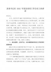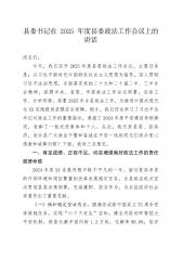 县委书记在2025年度县委政法工作会议上的讲话同志们:今天,我们召开2025年度县委政法工作会议,主要任务是:以习近平新时代中国特色社会主义思想为指导,深入贯彻习近平法治思想,全面落实党的二十大和二十届二中、三中全会精神,按照中央、省委、市委政法工作会议部署,总结工作、分析形势,部署2025年全县政法工作,为推进中国式现代化XX实践提供坚强安全保障。刚才,我们传达学习了习近平总书记对政法工作的重要指示,通报了2024年度平安建设考核情况,表彰了一批先进集体和个人。在此,我代表县委、县政府,向全县广大政法干警和奋战在平安一线的同志们表示衷心感谢和诚挚问候!下面,我讲三点意见。一、肯定成绩、正视不...