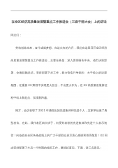 在全区经济高质量发展暨重点工作推进会(三级干部大会)上的讲话同志们:劳动创造未来,奋斗成就梦想。在这火红的六月,我们在这里召开全区经济高质量发展暨重点工作推进会,主要任务是:深入贯彻落实中央、省市决策部署,全面回顾总结,安排部署下步工作,着力营造只争朝夕、大干快上的浓厚氛围,在重振XX辉煌中实现更大担当,干出更大作为,在XX高质量发展新征程中站上新起点、实现新跨越。刚才,会议表彰了2021年涌现出的先进集体和先进个人,五家单位做了典型发言。在此,我代表区四大班子,向受到表彰的先进集体和先进个人表示祝贺!向奋战在全区各条战线上的广大干部群众表示衷心感谢和崇高敬意!XX同志安排部署了今后一个时期的...