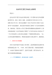 在全市关工委工作会议上的讲话同志们:这次全市关工委工作会议主要任务是:学习贯彻XJP总书记重要指示和中办、国办《意见》精神,总结我市关工委2021年工作,部署2022年工作。刚才会议通报了2021年全市关工系统“十佳五老”和“十佳先进集体”,他们是全市各级关工委和广大“五老”的优秀代表。借此机会,我代表xx市关工委向受到通报的先进集体和个人表示热烈的祝贺!向全市各级关工委和广大“五老”以及关心支持关心下一代工作的各界人士表示衷心的感谢!下面我先讲两点意见。一会,xx部长还要作重要讲话,希望各地各级关工委认真学习,狠抓落实。一、2021年工作回顾2021年是中国共产党成立100周年,是党和国家历...