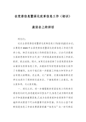 在党委信息暨深化改革信息工作(培训)座谈会上的讲话 同志们: 这次全县党委信息暨深化改革信息工作(培训)座谈会议,主要是对2023年全县党委信息暨深化改革信息工作进行简单小结,相互交流信息工作的经验及体会,以会代训提高大家的思维和写作水平,进一步把我县的党委信息工作抓实、抓好、抓出成效。刚才,X同志总结安排了全县党委信息和全面深化改革信息工作,并就如何写好党委信息给大家作了专题辅导,这对于我们进一步提高工作能力和写作水平会有很大的帮助。农业局、文广新局、交通运输局等先进单位也进行了很好的交流发言。下面我再讲三点意见,供大家参考,与大家共勉。 一、深化认识,进一步增强做好党委信息工作的责任...