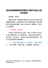 铭记党史砥砺奋进在市委中心组学习会议上的研讨发言各位领导,同志们:根据会议安排,现围绕学习贯彻XJP总书记关于党史学习教“”育重要讲话精神、全省全国全市两会精神和省委、南充市委党史学习教育安排部署,结合工作实际作一简要发言,不妥之处,敬请指正。一、铭记党史、滋养精神中国共产党的百年奋斗历程,蕴含了中国共产党为什“”么能的精神密码,是一座资政育人、继往开来的丰富矿藏。“学好党史、铭记党史,从党史中汲取丰厚的思想滋养,解”“”锁百年党史背后的精神密码。“”——“(一)党史是最好的教科书,铭记苦难增强理想信”念。“”砍头不要紧,只要主义真。杀了夏明翰,还有后来人。更多公文素材、写作指导请加微信:Ki...