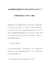 XX县纪委常委、监委委员2025年度民主生活会个人对照检查材料(五个带头)(精品)根据本次民主生活会主题要求,本人紧扣深入学习贯彻习近平新时代中国特色社会主义思想,全面贯彻落实党的二十届三中、四中全会精神及习近平总书记系列重要指示批示精神,聚焦锲而不舍落实中央八项规定精神、推进作风建设常态化长效化这一核心,紧密结合分管党风政风监督室、组织部(内设)、干部监督室的工作职责,深入查摆自身问题,深刻剖析思想根源,明确整改方向。现将对照检查情况报告如下。一、存在的主要问题对照民主生活会主题和五个方面检视重点,结合分管工作实际,深入查摆出以下问题。(一)在带头强化政治忠诚、提高政治能力方面一是从政治高度...
