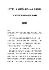 关于审计局党组理论学习中心组主题教育“以学正风”研讨班心得发言材料(2篇)篇1:在局党组理论学习中心组以学正风专题研讨交流会上的发言材料范文 审计机关落实“以学正风”的重要要求,重在两个方面:一是以学正己,做到打铁还要自身硬;二是以学正人,打造经济监督的“特种部队”。今天我就结合个人的学习领悟、工作经历以及分管工作,与大家作个交流。 一、大兴务实之风,重在察实情、出实招、求实效。一是基础要夯实。我们的审计对象很多,需要落实研究型审计的要求,夯实审计工作的基础,每到一个单位都要把基本情况摸清楚、关键问题找清楚、政策依据说清楚,同时严格落实“三个区分开来”要求,做到证据确凿、定性准确、依据正确...