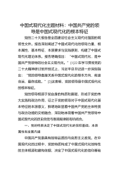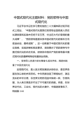 中国式现代化主题材料:中国共产党的领导是中国式现代化的根本特征党的二十大报告是全面建设社会主义现代化强国的纲领性文件。报告深刻阐述了中国式现代化的领导力量、根本属性、基本特征、本质要求与实践原则,构建了中国式现代化理论体系。报告明确指出:“中国式现代化,是中国共产党领导的社会主义现代化。”[1]22在学习贯彻党的二十大精神研讨班开班式上,习近平总书记进一步深刻指出:“党的领导直接关系中国式现代化的根本方向、前途命运、最终成败。”[2]这表明,党的领导是中国式现代化的根本特征。党的领导根源于党自身的特质和禀赋,形成于党的伟大实践和政治作用,证之于党的领导对于中国式现代化基本特征的本源意义,鲜明地...