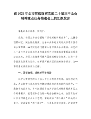 秘书长在市委理论学习中心组学习贯彻党的二十届三中全会精神研讨会上的交流发言同志们:党的二十届三中全会吹响了进一步全面深化改革的冲锋号,开启了新征程推进中国式现代化的时代新篇。全会召开前,总书记来到我省考察调研,强调“以进一步全面深化改革为动力,奋力谱写中国式现代化省域篇章”。全市党办系统认真学习贯彻党的二十届三中全会精神以及总书记考察我省时的重要讲话精神,坚定扛牢“走在前、挑大梁”的重大使命,感恩奋进、加力提效,以改革创新精神扎实推动“三服务”工作高质量发展,为奋力谱写中国式现代化**篇章贡献党办力量。一、筑牢忠诚根基,以坚守不变、矢志不移的信仰引领改革对党绝对忠诚是党办的生命线,必须时刻牢记...