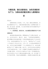 专题党课:强化创新驱动,加快发展新质生产力,为推动高质量发展注入澎湃新动能同志们:按照局党组工作安排,今天,我以《强化创新驱动,加快发展新质生产力,为推动高质量发展注入澎湃新动能》为题,给大家讲一堂党课,与大家共同探讨如何发展新质生产力推动高质量发展。一、学深悟透、把准方向,切实增强发展新质生产力的战略主动高质量发展的新实践,需要新的生产力理论来指导。去年,总书记在四川、黑龙江、我省、广西等地考察调研时,提出要整合科技创新资源,引领发展战略性新兴产业和未来产业,加快形成新质生产力。12月,“新质生产力”正式写入中央经济工作会议文件。今年1月,中央政治局集体学习时,总书记全面系统阐释了“什么是新...