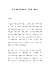 在XX县委工作务虚会上的讲话(精品)同志们:今天,我们召开县委工作务虚会,主要任务是深入学习贯彻党的二十届三中、四中全会精神和习近平总书记考察我省重要讲话精神,全面盘点总结今年的工作,精准分析当前面临的形势,系统科学谋划明年的发展思路、目标任务和关键举措。刚才,部分乡镇和县直单位的负责同志作了很好的发言,各位县领导也结合分管领域提出了许多富有见地的意见建议,听了之后很受启发。大家准备充分、思考深入,既总结了成绩、也剖析了问题,既立足当前、也着眼长远,达到了集思广益、凝聚共识、明确方向的预期目的。2025年是“十四五”规划的收官之年,也是我们应对挑战、砥砺前行的关键一年。回望即将过去的一年,面对...